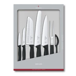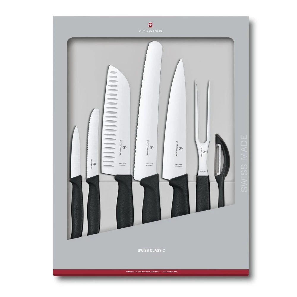 The Swiss Classic 7-Piece Kitchen Knife Set by Victorinox features 5 Swiss-made knivesĀ with sharp blades that hold their edges, as well as an all-purpose peeler and a carving fork.