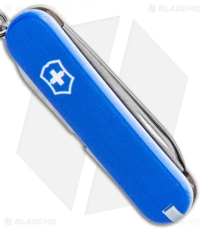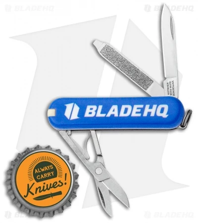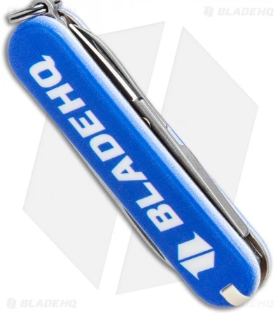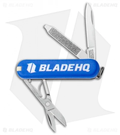 This Blade HQ Exclusive Victorinox Classic SD model has a blue handle with a Blade HQ logo on the reverse side.